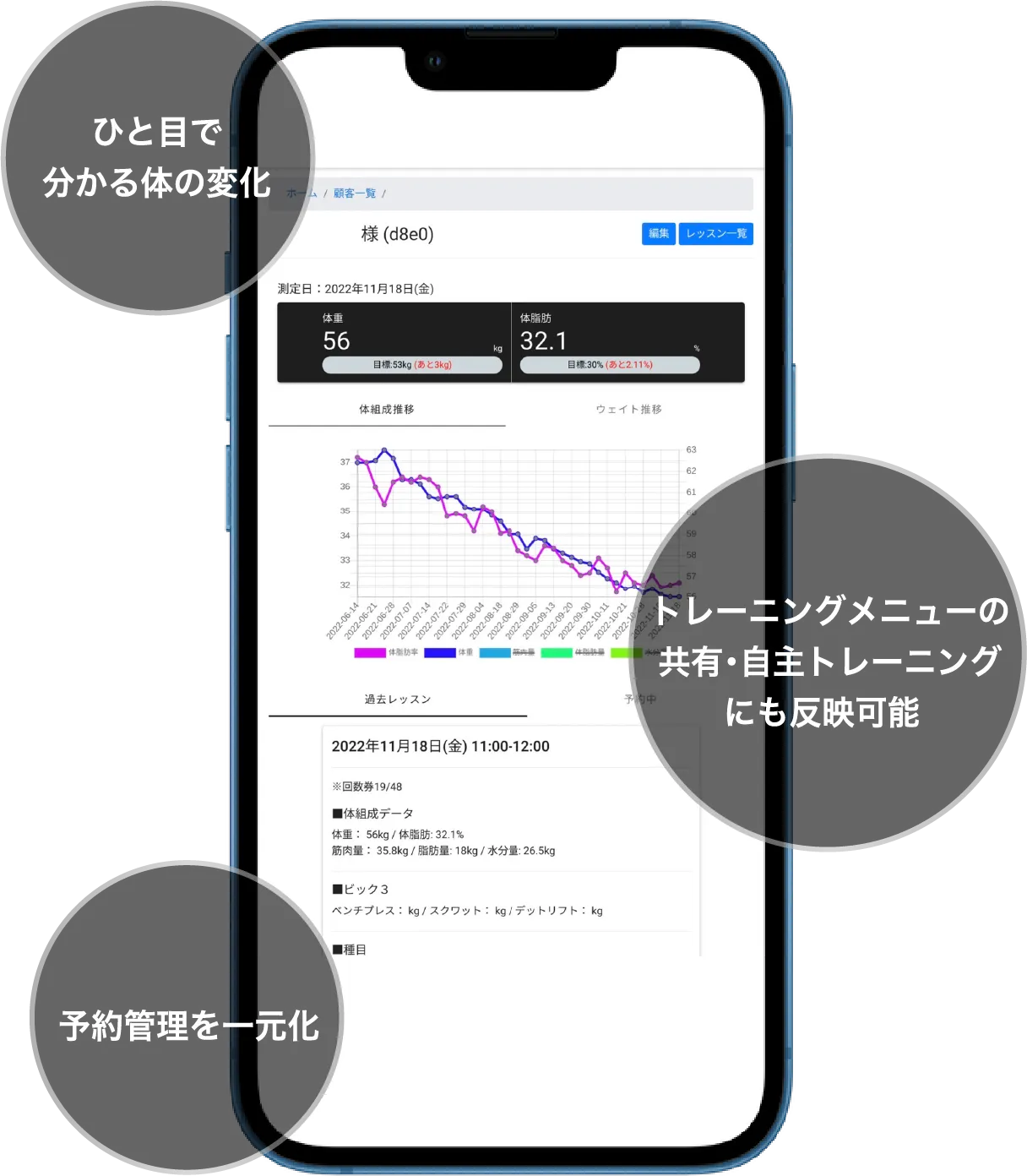 体重・挙上重量の変化、毎回のトレーニングメニューを確認出来、アプリを見ながら自主トレーニングをして頂く事も可能。